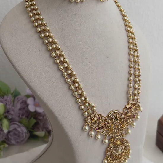 Elegant Three Layer Pearl Necklace with Floral Motif Pendant Drop